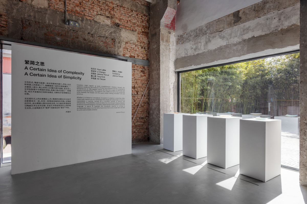 无论是形式上的还是概念上的,陶瓷的创新往往与技术创新联系在一起。实现一种简单但独特的风格,在陶瓷创作中,依 旧需要无数失败和改良。本次展览希望能探讨陶瓷艺术在技术创新、实验艺术和视觉语言之间的相互关系,凸显陶瓷艺术“简 单”风格背后的“复杂”宇宙。 拉巴尔(Ryan LaBar)美国陶瓷艺术家。相较于制作功能性的锅碗用具,拉巴尔倾向于创造一种简单形状的语汇。他将这 些形状置于陶轮上组合。付出大量体力劳动,将其组装成精致的矩阵,然后送入窑中。当窑炉中的高温融化粘土和釉料时, 之前堆叠的部件融合在一起,形成稳定的复合物。通过形式上的扭曲、弯曲和相互作用,最终的艺术品反映出各个组成部 分之间的张力、混乱、和谐和统一。 李成宇的定格动画视频灵感源于一个看似普通的事件——其公寓里的漏水事件。运用各种材料,包括玻璃、陶瓷和绘画, 艺术家精心重建了这个场景。他从简单的出发点开始,通过动画叙事逐渐引导我们进入一个生动而复杂的平行宇宙,这个 宇宙作为独立的系统,受其自身规则和超越寻常的复杂性支配。 杰瑞米(Jérémie Thircuir)的陶瓷雕塑让人想起上个世纪的意大利装饰艺术。他使用玉瓷,融合了不同的滑铸和陶瓷技术。 杰瑞米从各个农场采购相同的果蔬,灌筑的作品旨在质疑作者身份问题,使观者重新陶醉于自然形状的美。陶瓷蔬菜没有 颜色、气味和味道,突出了其抽象特质,使观者能够感受到蔬菜形态、线条和图案的简单与复杂的完美,这些自然几何形 状是在数百万年的演化中逐渐形成的。 童心迪的瓷板釉面画探索了技术创新与艺术创作之间的关系。作为一名摄影师,童新迪重新诠释了唐代著名的“三色釉”。 他并非随意或平淡地应用釉料,而是采用了自己发明的釉料3D 打印机,创造了充满活力的图案,充分利用光反射和纹理效果。 为了实现他的作品,童新迪开发了新技术,拓宽了陶瓷媒介的可能性,创造出人工难以复制的图像和纹理。这也使他的实 践保持与时俱进,既传承了艺术的历史遗产,又展现了当代创新的精神。
